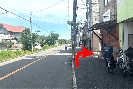 8「パチンコニコニコ様」の駐輪場を過ぎ、右に曲がります。